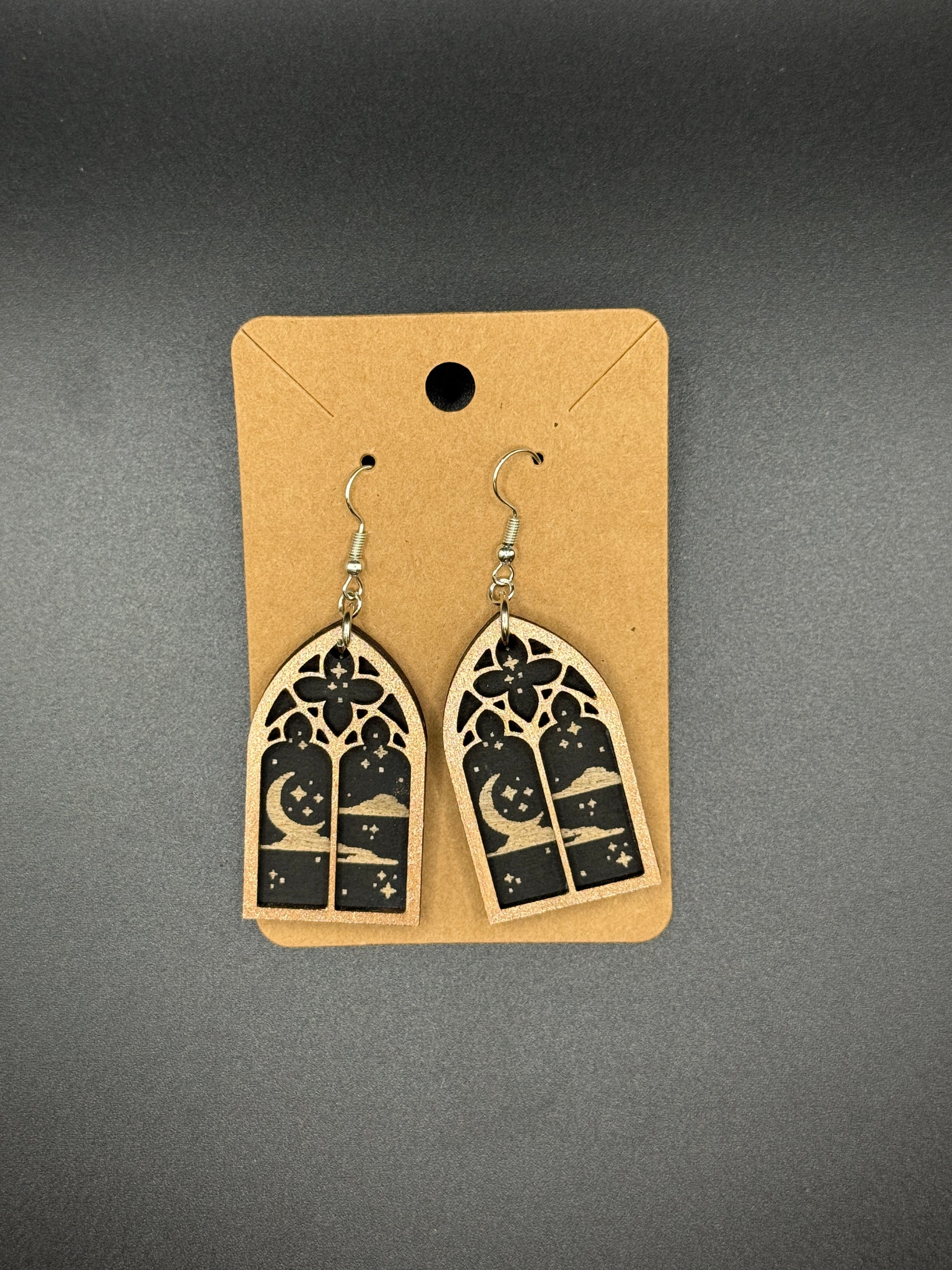 Gothic Window Moon Earrings – Laser Cut Wooden Celestial Dangles