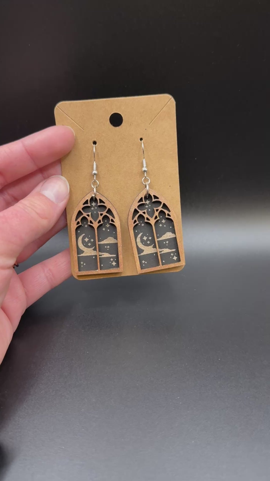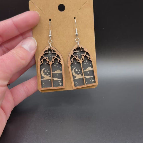 Step into a tiny midnight cathedral. These gothic window–inspired earrings feature a crescent moon drifting over a star-scattered sky, framed in an elegant arched silhouette. Laser cut and engraved from lightweight wood, they have the look of stained glass with a moody, celestial twist.